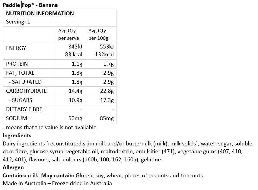 Experience the nostalgic treat Banana Paddle Pop® Ice-cream in a revolutionary new form, freeze-dried! Summer captured in every bite, now in a lightweight, crunchy treat...without the messy drips. Perfect snack for any adventure.