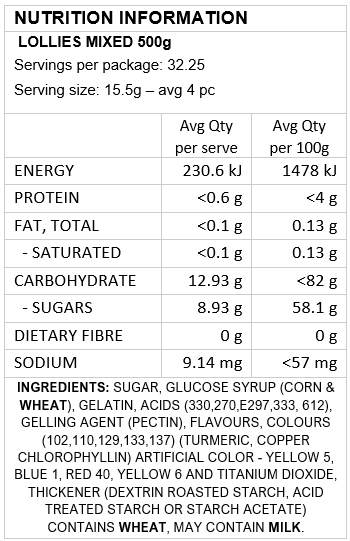 General Ingredients - Glucose syrup (wheat or corn), sugar, wheat starch, gelatine (bovine), acids: (330, 270, 297, 333), gelling agent: (pectin), flavours (including Black Carrot, Spirulina, Safflower, Turmeric, Copper Chlorophyllin), colours: (102, 110, 120, 129, 133, 171), Cane Thickener, Invert Syrup, (Bovine), Dextrin Roasted Starch, Acid Treated Starch Or Starch Acetate, Modified Maize Starch, Acid Modified Glazing Agent, Modified Potato Starch, water. CONTAINS: Wheat, may contain milk.