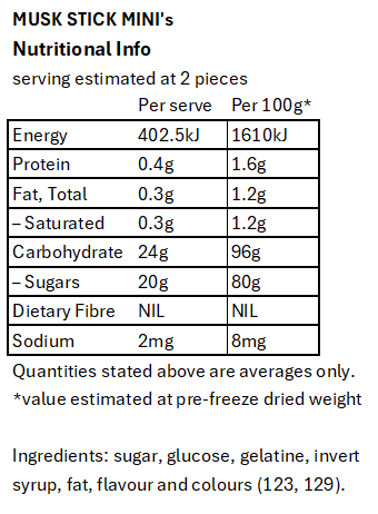 We've taken the classic pink musk stick and given it a modern makeover. Freeze-dried to perfection, these old-school favourites transform into light, crisp bites that dissolve in your mouth with an intense floral-sweet burst of nostalgic flavour. Whether you're a die-hard musk lover or just chasing that retro Aussie vibe, these are a must-try twist on a timeless treat.