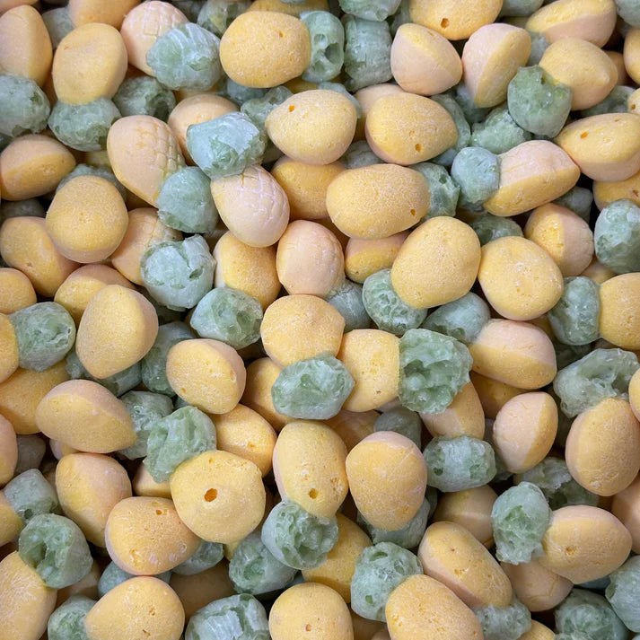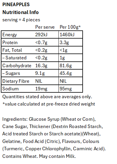 We’ve taken the classic chewy pineapple lolly and blasted it into a whole new dimension. Freeze-dried to crispy perfection, these golden treats are light, airy, and packed with a sweet tropical punch that melts on your tongue.