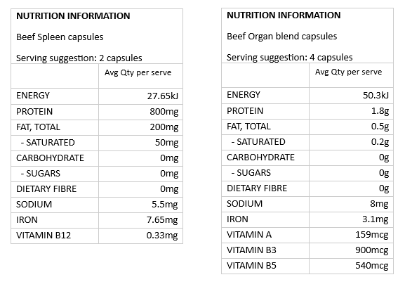 Beef Spleen - Iron rich. Contains 90 capsules. Box of 75. Ingredients per capsule: 81% Australian Beef Spleen (500mg), 19% Bovine Gelatine Capsule (120mg) size 00. Suggestion 2-3 capsules per day.