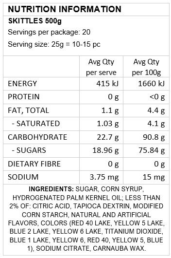 Ingredients: Made with only Skittles. Sugar, Glucose or Corn Syrup, Vegetable or hydrogenated palm kernel oil, <2% of food acids (330, 331), Tapioca Dextrin, Modified Corn Starch, Flavours (natural & artificial), Colours (171, 129, 110, 132, 133), Glazing Agent (903). May contain: Soy. Processed in a facility that also handles allergens such as nuts, seafood, shellfish, gluten etc under HACCP guidelines.