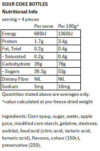 Your favourite sour cola lollies just levelled up. Freeze-dried into ultra-light, crispy bites, these sour Coke bottles pack a fizzy tang and bold cola flavour that hits hard and melts fast. It’s everything you love—louder, crunchier, and wildly addictive.